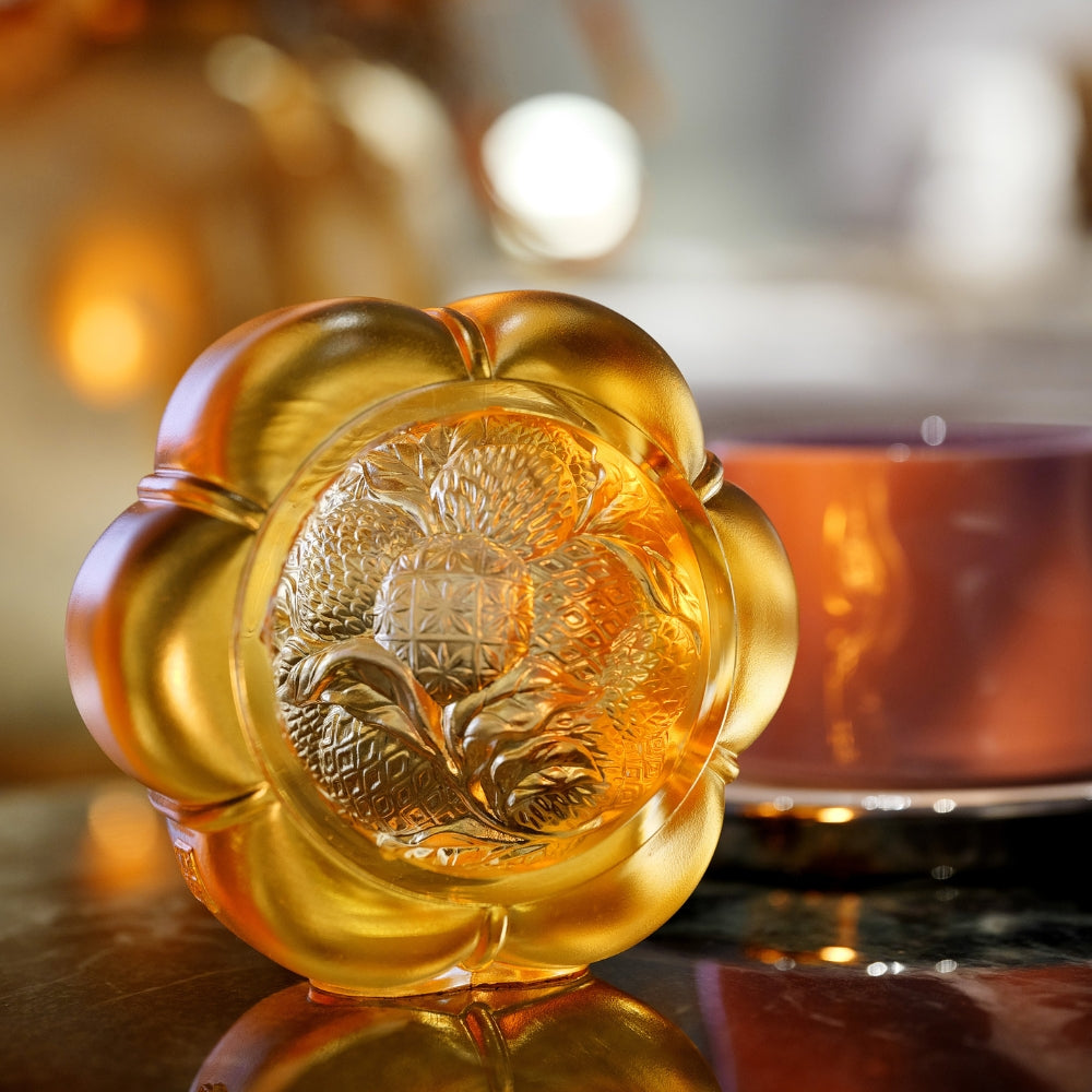 The Collection: Fortune Arrives Sequentially Design Concept: Auspiciousness in Gold centers on the golden pumpkin, a traditional symbol of wholeness, abundance, and inner richness. Hidden within are six lychees, signifying smooth fortune and blessings layered upon blessings. The pumpkin’s grounded form conveys stability and resilience, while the lychees introduce sweetness and vitality, creating a harmonious balance between strength and gentleness. Bathed in a warm golden glow, the work reflects prosperity that grows quietly from within, expressing a happiness that is full, balanced, and enduring. The artwork may be displayed standing or placed face down: when standing, it absorbs and reflects light through the negatively engraved lychees, allowing fortune to radiate outward; when placed down, the pumpkin becomes a protective cover, gently safeguarding happiness and prosperity within. 南瓜,又名金瓜,象征圆满与丰收;内藏六颗荔枝,寓意「六六大顺、福中有福」。作品以金色琉璃引入光之流动,外圆内实,甜润成形。南瓜给人印象是接地气的,内核坚定,荔枝则更轻盈,甜蜜娇俏,聪慧灵动。这二者融合,粗中有细,不急不躁的气定神闲。琉璃的金色光芒,是一种自心而发的柔亮,不刺眼,不张扬,不具备攻击力,它像阳光透过果皮,静静释放温度与能量,象征「善念与富足的延续」。 |